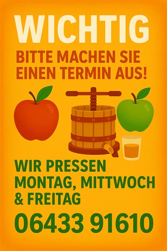 Es geht wieder los mit dem Apfelsaft. Die Presse ist geputzt und steht bereit. Der erste Termin ist am 11.September 2023 Für Termine und Uhrzeiten bitte anrufen 06433-91610 oder... ...mehr18. August 2023